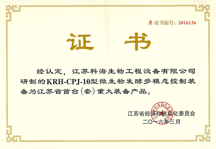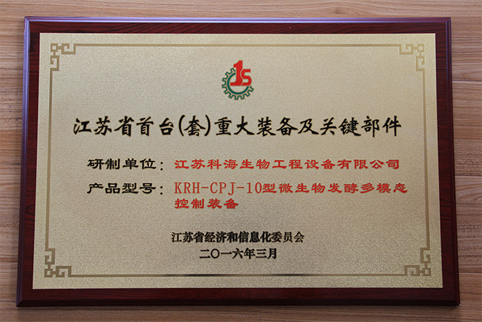 熱烈慶祝江蘇科海研制的“KRH-CPJ-10型微生物發酵多模態控制裝備”榮獲“江蘇省首臺套重大裝備及關鍵部件”榮譽稱號